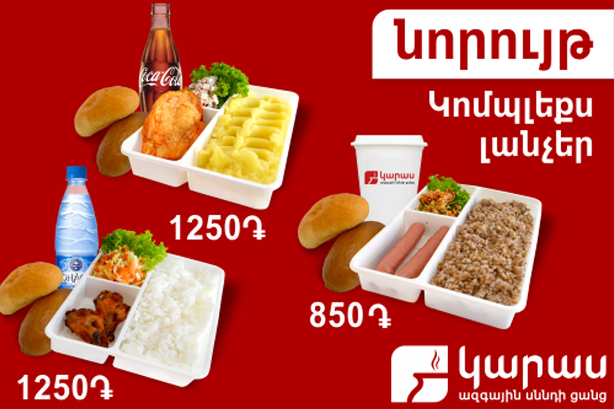 <p><strong>ք. Երևան,&nbsp;</strong><strong>12</strong><strong>&nbsp;</strong><strong>հունիսի</strong><strong>,</strong><strong>&nbsp;2013թ.</strong><strong>&nbsp;</strong><strong>ԿԱՐԱՍ</strong><strong>&nbsp;</strong><strong>ցանցի</strong><strong>&nbsp;</strong><strong>ռեբրենդինգի</strong><strong>&nbsp;</strong><strong>շրջանակում&nbsp;</strong><strong>ծրագրված որակական փոփոխությունների արդյունքում Կարաս մենյուն համալրվել է կոմպլեքս լանչերի լայն տեսականիով:</strong></p><p>Կարաս ազգային սննդի ցանցն իր հաճախորդներին ներկայացնում է համեղ ընդմիջման շահավետ առաջարկ: 1 ստանդարտ կոմպլեքս լանչի արժեքն է` 1250 դրամ: Այն ներառում է տաք ուտեստ, խավարտ, աղցան, զովացուցիչ ըմպելիք և հաց: Մենյուում ներկայացված է նաև ավելի մատչելի տարբերակ` կոմպլեքս լանչ “էկոնոմ”, ընդամենը` 850 դրամ:</p><p>Կոմպլեքս լանչերը հնարավոր է պատվիրել Կարաս առաքման ծառայության միջոցով` զանգահարելով 32 55 55 հեռախոսահամարով:</p><p>Հիշեցնենք, որ սույն թվականի մայիսի 14-ին Կարաս ընկերությունը հայտարարել է ռեբրենդինգի գործընթացի մեկնարկի մասին: Ռեբրենդինգի իրականացման որոշումը պայմանավորված է 2013-2014թթ. պատվախնդիր բիզնես նպատակներով, ինչպես նաև սպասարկման առջև դրված ժամանակի պահանջներին համապատասխանելու պատրաստակամությամբ:</p>