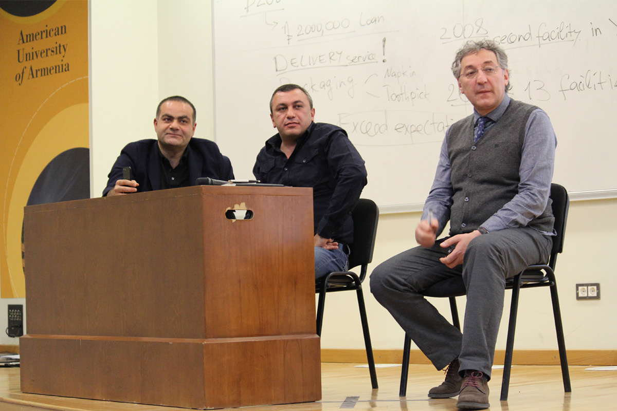 <p>Ս.թ. դեկտեմբերի 8-ին ԿԱՐԱՍ ազգային սննդի ցանցի համասեփականատերեր Տիգրան Յուզբաշյանն ու Աշոտ Հարությունյանը հանդիպում ունեցան Հայաստանի ամերիկյան համալսարանի (ՀԱՀ) ուսանողների հետ՝ ներկայացնելով Կարաս բրենդի կոնցեպտը, ստեղծման պատմությունը, անցած ճանապարհի դժվարությունները ու հաղթահարման ուղիները: Հանդիպման արդյունքում կարող ենք նշել, որ քննարկումն անցավ հետևյալ թեմայի շուրջ՝ “Ինչպես դառնալ հաղթող մրցակցային շուկայում ու մնալ այդպիսին ավելի քան 11 տարի”:<br>Ավելի քան 2 ժամ տևած ինտերակտիվ հանդիպմանը ուսանողները հնարավորություն ունեցան տեղեկանալու Կարաս-ի անցած ուղուց, վարչակազմակերպչական կառուցվածքից, &nbsp;«Վերակառուցման և Զարգացման Եվրոպական Բանկ»-ի հետ համագործակցության արդյունքներից, ինչպես նաև նոր շուկաներ գրավելու որոշումներից: Հանդիպման սկզբում նշվեց, որ ամենահետաքրքիր, բարդ հարցերի հեղինակները կստանան Կարաս-ի նվեր քարտեր, և ուսանողներից յուրաքանչյուրը ջանք չէր խնայում հաղթող ճանաչվելու համար: Հարցերը վերաբերում էին Կարաս-ի՝ շուկայի խոշորագույն առաքման ծառայությանը, առողջ մրցակցությանը, առաջնորդության հմտություններին, ինչպես նաև՝ որքանով է բարդ կամ միգուցե հեշտ մանկության ընկերներին աշխատել իրար հետ: Այս հարցին Տ. Յուզբաշյանը պատասխանեց, որ Ա. Հարությունյանի հետ միայն մեկ իր չեն կարողանում կիսել, այն է՝ կրակայրիչը:)</p>