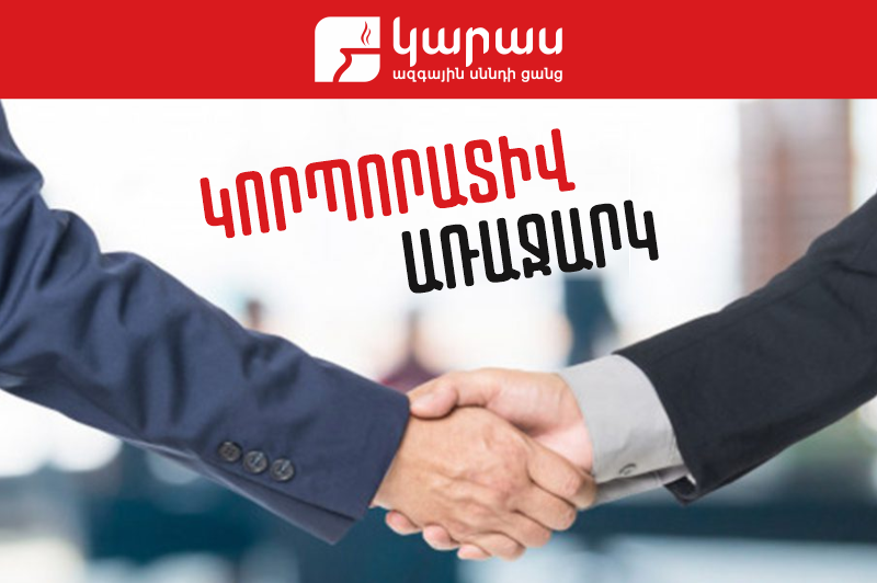 <p>Սիրելի հաճախորդներ,</p><p>տեղեկացնում ենք, որ այսուհետ կորպորատիվ հաճախորդների համար Կարասը ներկայացնելու է առավել հարմար և հատուկ առաջարկներ։</p><p>Մենք առաջարկում ենք․</p><p>1. գնի և որակի ամենաշահավետ համադրությունը,</p><p>2. 300+ ուտեստներ,</p><p>3.արագ առաքում:</p><p> </p><p>Համագործակցության համար կարող եք զանգահարել՝ 095 32 55 52:</p><p> </p>
