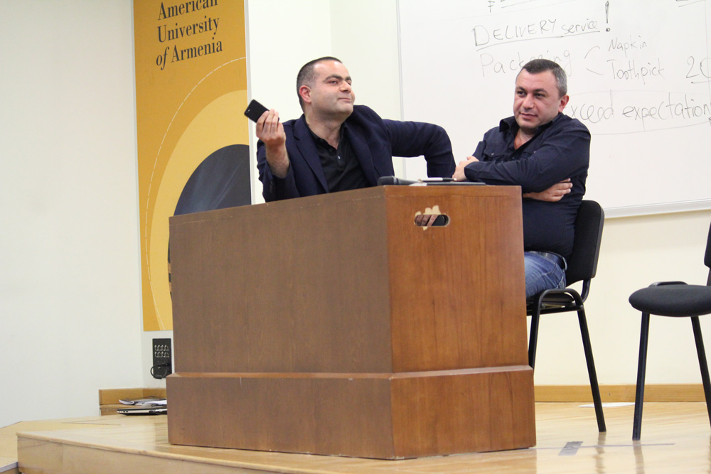 <p>December 8, 2016. The owners of national food chain KARAS Tigran Yuzbashyan and Ashot Harutyunyan held a meeting with the students of the American University of Armenia (AUA) and presented the concept of Karas’ brand, told about the history of Karas’ foundation, as well as the difficulties on their way and the overcoming of the last. As a result of the meeting, we can surely say that the topic of the discussion was “How to become a winner in the market and stay a leader for more than 11 years.”<br>During an interactive discussion that lasted more than two hours, the students got an opportunity to learn about the interesting way of Karas, the structure of their corporate governing and cooperation with “European Bank of Reconstruction and Development.” In the beginning of the meeting, it was announced that the authors of the hardest and the most interesting questions will be presented with Karas gift cards and every student put their effort to become a winner. The questions regarded Karas having the biggest delivery system in the market, healthy competition, leadership skills, as well as, how difficult or easy it is to work together being childhood friend. To this question, T. Yuzbashyan asnswered that that there's only one thing they cannot share with A. Harutyunyan and that is a lighter.<br>The work of Karas' leadership is a bright example of how working hard can help one achieve heights and hold their position of a leader, thus becoming a great motivation for the youth.&nbsp;</p><p>&nbsp;</p><p>&nbsp;</p>